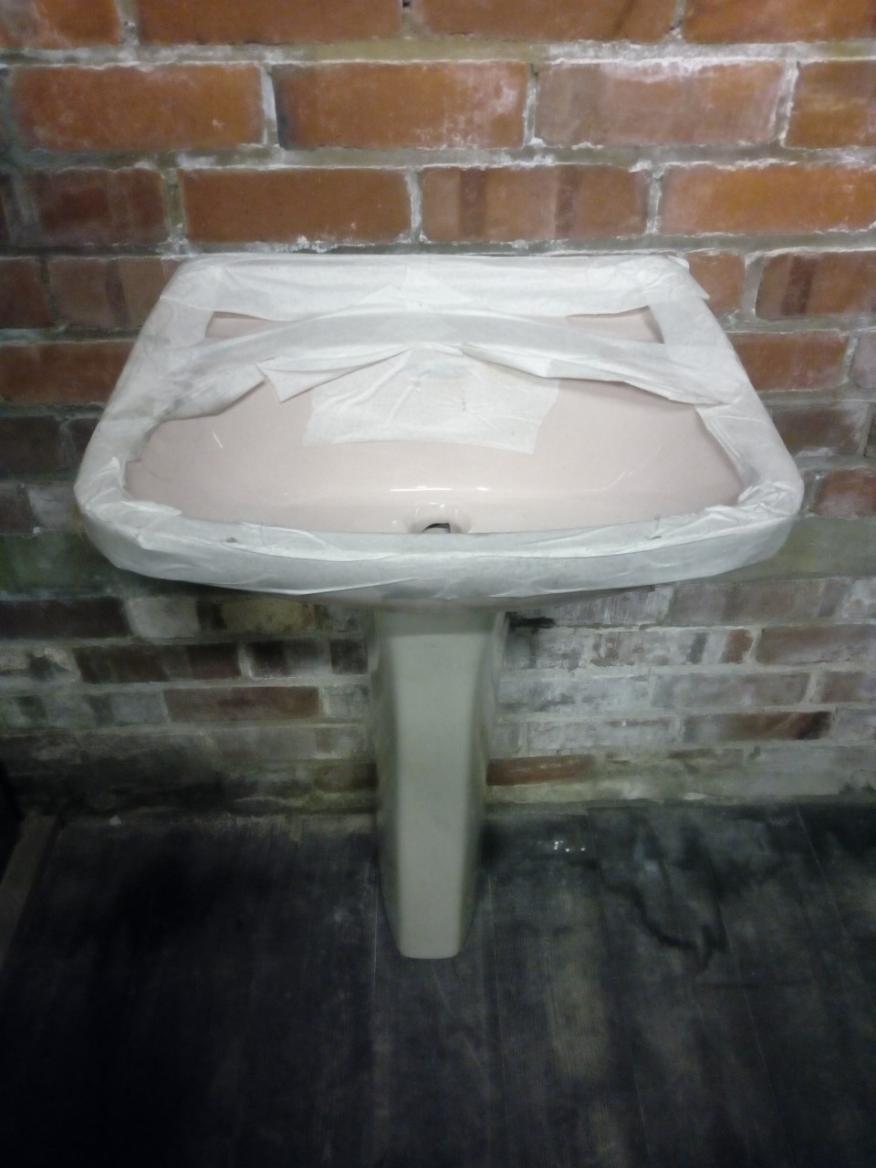 The Rainbow Wash Consists of a 22 x 16" Standard size Two tap hole basin in Coral pink By Qualcast & Indian Ivory Colour Pedestal. Priced at £150 In Total.